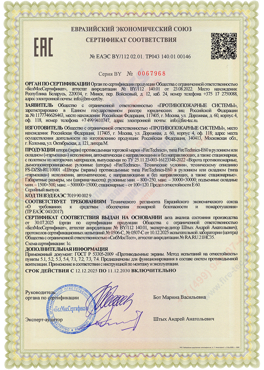 Сертификат соответствия на Дымозащитные (противодымные) шторы FireTechnics модели FireTechnics-E60 № ЕАЭС BY/112 02.01. ТР043 140.01 00146
