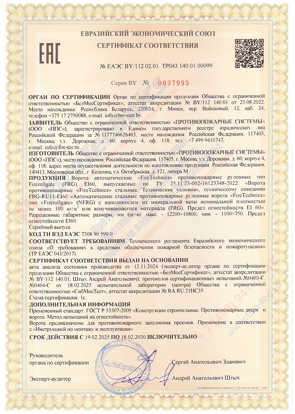 Евразийский Экономический Союз, Сертификат соответствия на Ворота FireTechnics типа Firerollgate EI60 (FRG) противопожарные (предел огнестойкости EI60), стальные, рулонные, глухие, автоматические (с электроприводом), выпускаемые по ТУ 5284-001-16123348-2020 «Ворота и шторы огнедымозащитные FireTechnics. Технические условия», техническому описанию FRG-RU11-EI60. Серийный выпуск.
